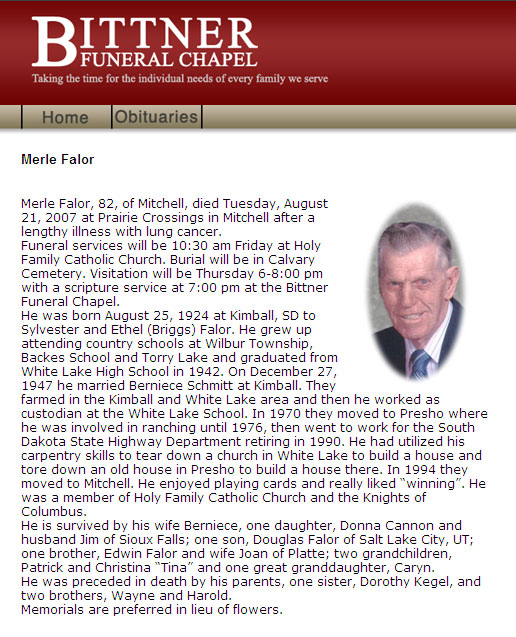 Merle Falor's obit, copied from the Bittner Funeral Home website.