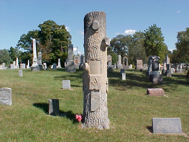 Nathan Fahler's monument is a tee - This usually marks the graves of Woodmen of the World members. Also, they usually contain other symbols such as anchors, lilies, vines, etc. Broken braches on the tree symbolize a life cut short.