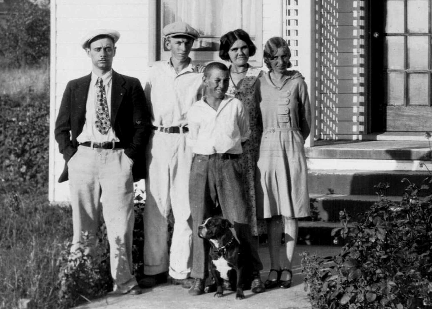 Webster and Falor families in front of house in Fortuna, California. Left to Right: Leland Lenore Falor, Harry Gallager Webster, Sylvanus "Va" Calno Webster, Hattie Alice Webster, Olive Myra Falor (Webster) - Leland's wife. Image scanned from an original tin type.