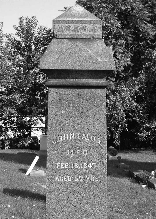 John A. and Kesiah Falor's tombstone at Mount Hope Cemetery, Akron OH. This is the south side of the tomb, stating that John died Feb. 18, 1847 aged 57 years.