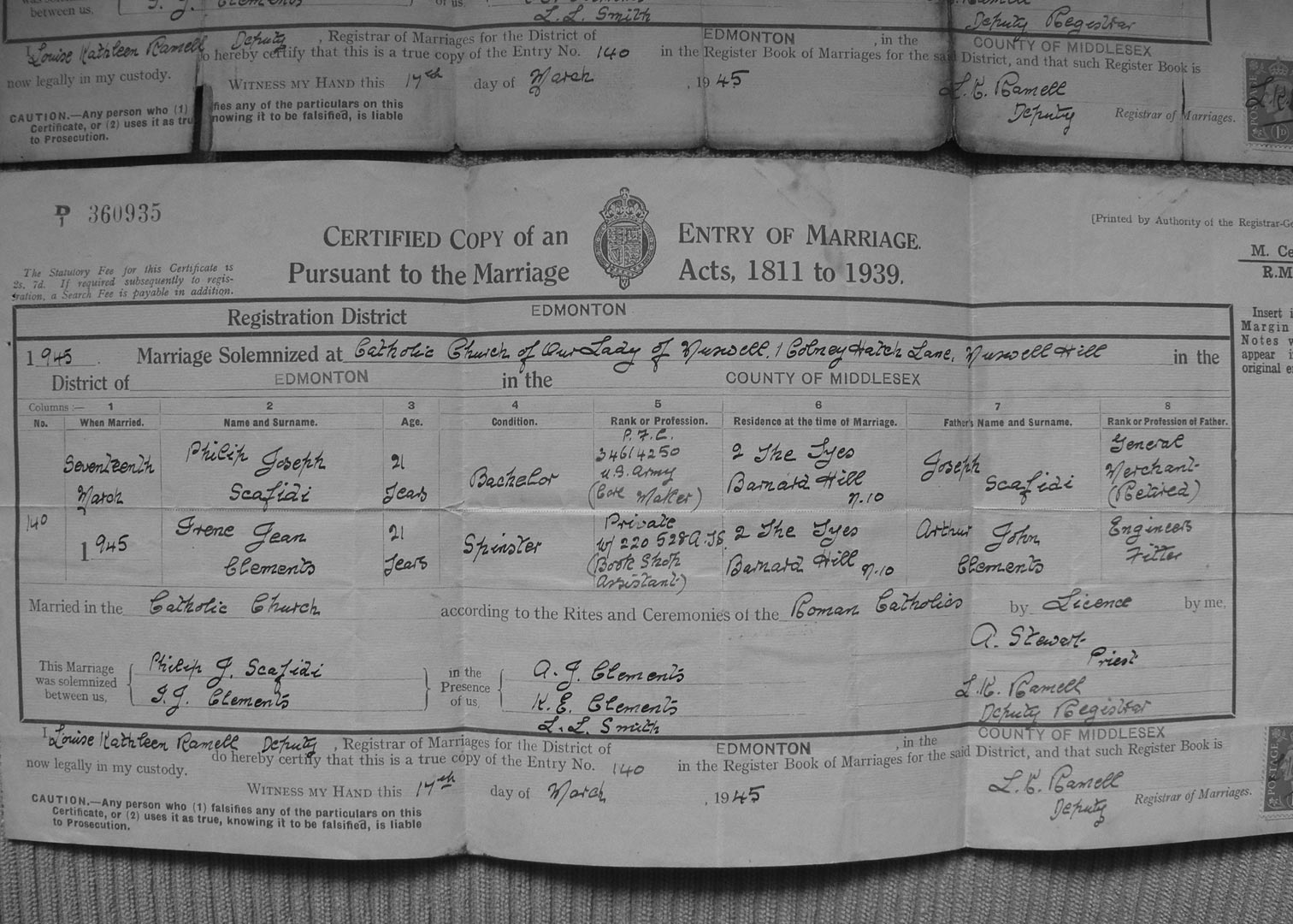 Irene and Philip's marriage certificate.