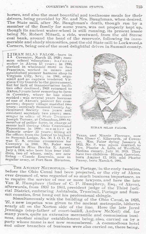 "Fifty Years and Over, Akron and Summit County", by Ex-Sherriff Samuel A. Lane, Page 715, discussing Hiram Silas Falor and his family.