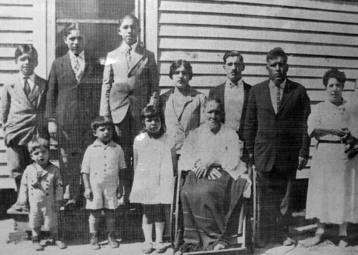 Scafidi Family, reading left to right, front row: Samuel, Philip, unknown girl, unknown lady in wheelchair, possibly Bessie Biondo. Back row, all unknown.