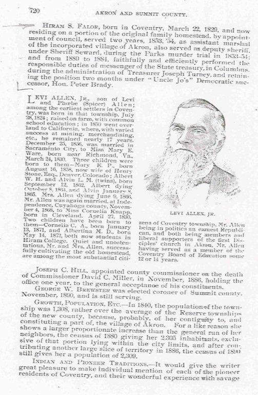 "Fifty Years and Over, Akron and Summit County", by Ex-Sherriff Samuel A. Lane, Page 720, discussing Levi Allen, Jr and a bit on Hiram Silas Falor.