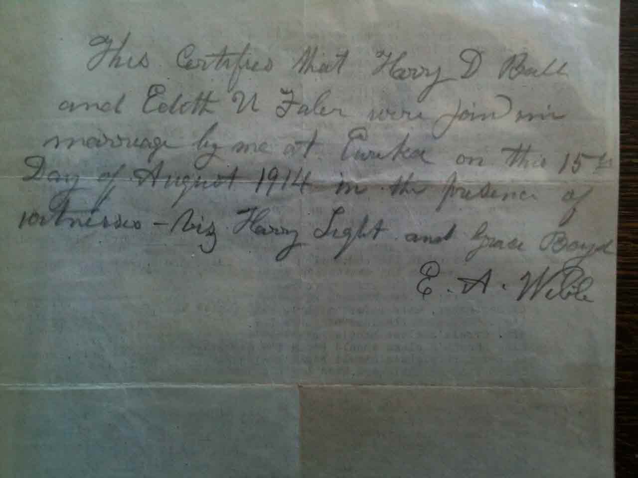 Steven Ball found this document folded inside a small leather binder. It is Harry D. Ball and Edith U. Falor's handwritten marriage cert is on the back of the typed school year plan!! Guessing the wedding witness Boyd is the same Boyd mentioned on the other side as a teacher. "This certifies that Harry D. Ball and Edith U. Falor were joined in marriage by me at Eureka on this 15th Day of August 1914 in the presence of witnesses (???) Harry Light and Grace Boyd. E. A. Wible"