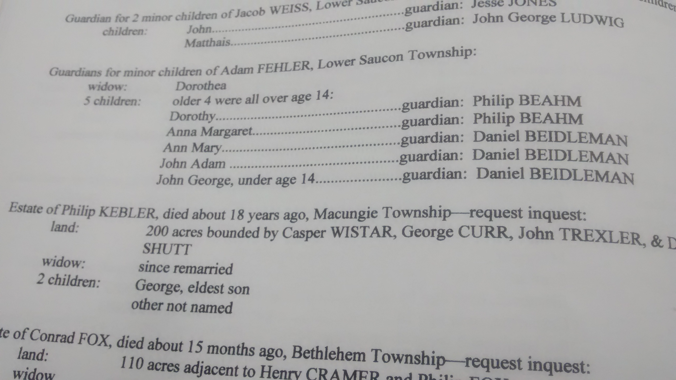 Court record listing the guardians for Adam Fehler's minor children in Lower Saucon Township. Found in the Northampton Library in Easton, PA.