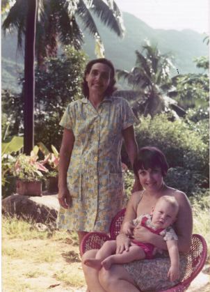 Milena Tirant with daughter, Marlene and grandson, Steven Falor in front of Milena's house in the Seychelles