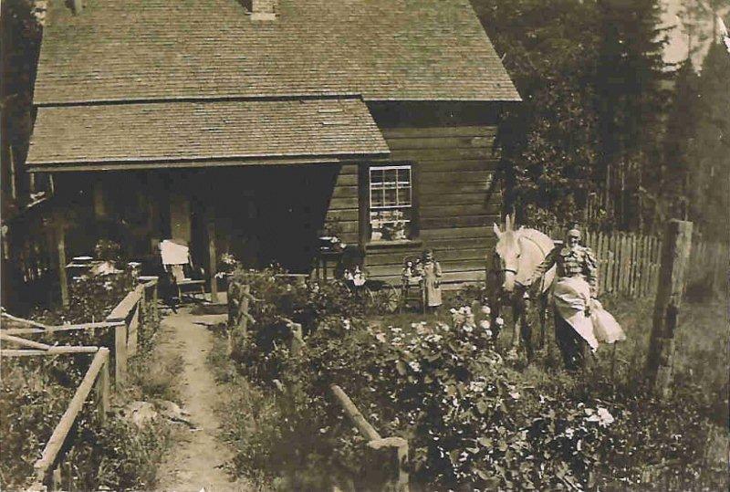 The Falor ranch at Maple Creek. Picture taken before 1900 of Arthur Pliney Falor's log cabin. The lady with the horse is Udella Ophelia Fidelity Falor (Smith), the girl is Edith Udella Falor. Note the large vegetable garden in the foreground.