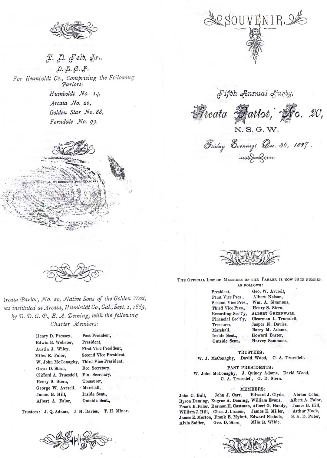 Native Sons of the Golden West souvenir meeting for December 31st 1887 listing Miles E. Falor, Albert A. Falor, Frank E. Falor as members