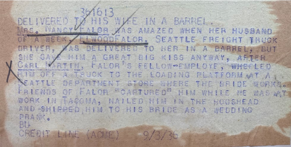 DELIVERED TO HIS WIFE IN A BARREL Mrs. Nancy Falor was amazed when her husband of a week, Elwood Falor, Seattle Freight truck driver, was delivered to her in a barrel, but she gave him a great big kiss anyway, after Carl Martin, Falor's fellow-employe (sic) wheeled him off a truck to the loading platform at a Seattle department store where the bride works. Friends of Falor "captured" him while he was at work in Tacoma, nailed him in the hogshead and shipped him to his bride as a wedding prank. BU Credit Line (ACME) 9/3/36
