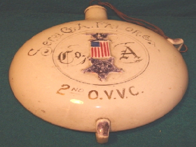 Sargent GA Falor's Civil War water canteen from the bottom. eBay description "G.A.R. named sergt G.A. Falor, company A, 2nd O.V.V.C, china, or stoneware canteen. Has the original stopper. One of the three china brackets was broken off. No other damage. A great early military piece"
