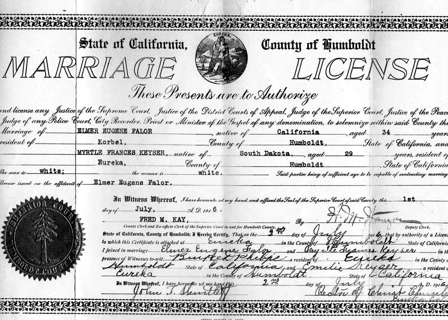Elmer Eugen Falor and Myrtle Frances Keyser's marriage certificate from July 1916.