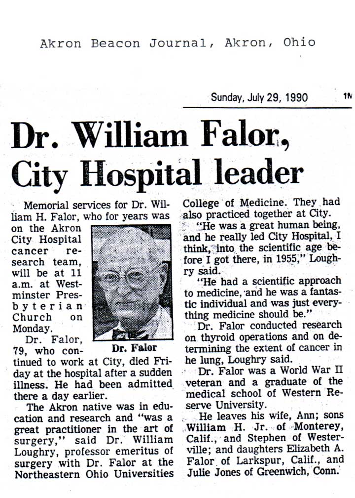 | (Witness) History | 29 July 1990 | Akron Beacon Journal, Akron, Ohio, Sunday, July 29, 1990 Dr. William Falor, City Hospital leader Memorial services for Dr. William H. Falor, who for years was on the Akron City Hospital cancer research team, will be at 11 a.m. at Westminster Presbyterian Church on Monday. Dr. Falor, 79, who continued to work at City, died Friday at the hospital after a sudden illness. He had been admitted there a day earlier. The Akron native was in education and research and “was a great practitioner in the art of surgery,” said Dr. William Loughry, professor emeritus of surgery with Dr. Falor at the Northeastern Ohio Universities College of Medicine. They had also practiced together at City. “He was a great human being, and he really led City Hospital, I think, into the scientific age before I got there, in 1955,” Loughry said. “He had a scientific approach to medicine, and was just everything medicine should be.” Dr. Falor conducted research on thyroid operations and on determining the extent of cancer in he lung, Loughry said. Dr. Falor was a World War II veteran and a graduate of the medical school of Western Reserve University. He leaves his wife, Ann; sons William H. Jr. of Monterey, Clalif., and Stephen of Westerville; and daughters Elizabeth A. Falor of Larkspur, Calif., and Julie Jones of Greenwich, Conn. Transcribed by Samantha Falor, 2005 1,4 |
