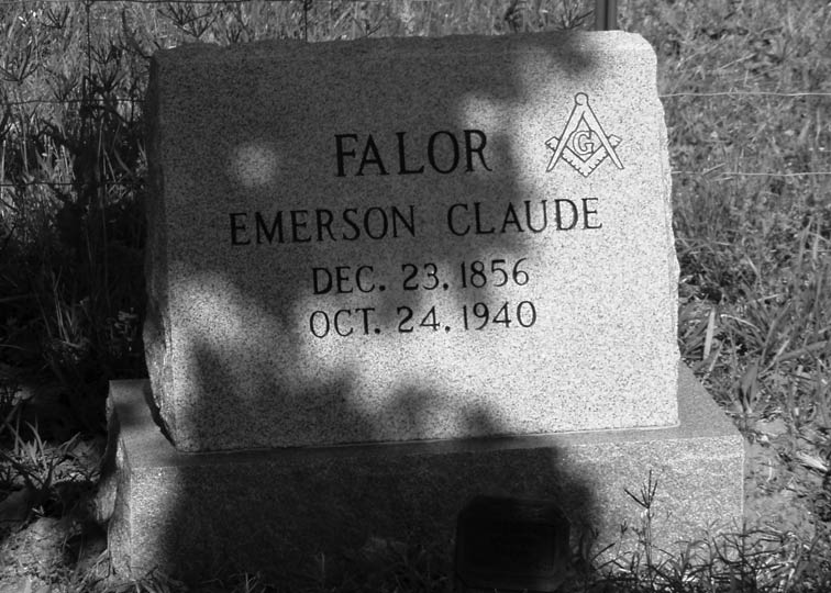 | (Witness) History | April 2008 | Emerson C. Falor is buried of the West side of the Stockdale Hwy 123 So. Take Land Ranch Road to the top of the hill then take dirt trail about 300 yards the cemetery is on the left. Janie said that Dad (Hiram Claude) told her that Emerson wanted to be buried there so he would be next to his first wife. Notes by Duehl Falor.1 |