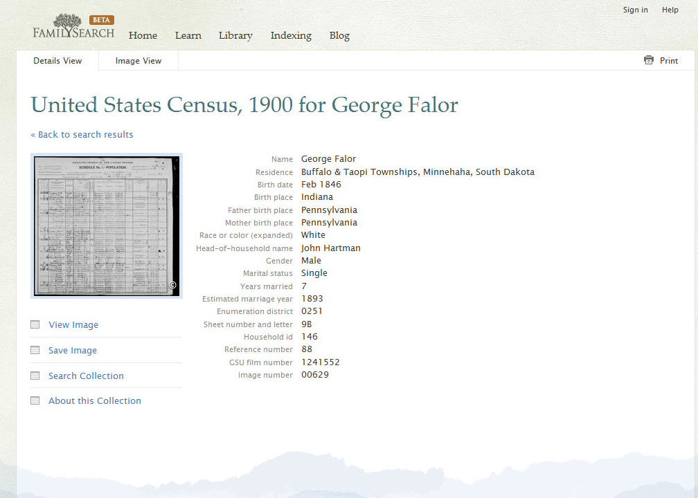 | Census* | 1900 | Buffalo & Taopi Townships, Minnehaha County, SD, USA ; Living with John Hartman, Marital status of single, but had been married for 7 years before starting in about 1893.Enumeration District 0251, Sheet 9B, Film Number 1241552, Image Number 00629 |